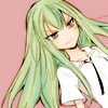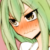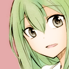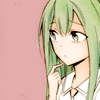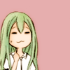 Description: Picture of a green haired girl smiling with her fist clenched in front of her chest.