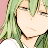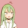 Description: Picture of a green haired girl with her finger on her chin, she's thinking.